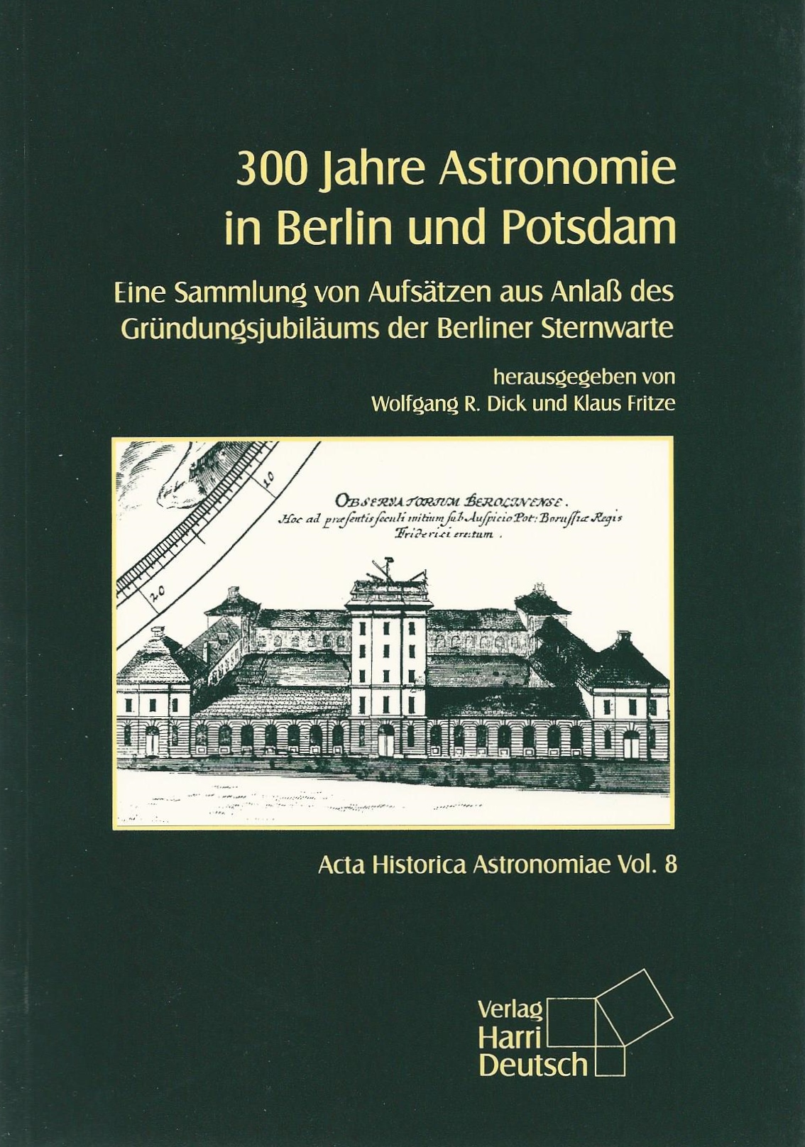 Wolfgang R. Dick, Klaus Fritze (Hrsg.): 300 Jahre Astronomie in Berlin und Potsdam. Eine Sammlung von Aufsätzen aus Anlaß des Gründungsjubiläums der Berliner Sternwarte. (Acta Historica Astronomiae ; 8). Thun ; Frankfurt am Main : Deutsch, 2000, 252 S., ISBN 3-8171-1622-5, 27 Abb., 15 x 21 cm, kartoniert EUR 16.80 / sFr 26.30.